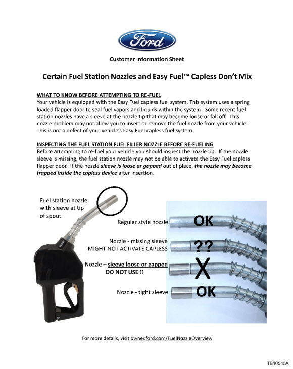 Some vehicles equipped with the Easy Fuel™ Capless Fuel System may exhibit a concern where a fuel nozzle cannot be inserted and/or removed. This concern may be caused by a problem with the fuel station nozzle. The sleeve at the tip of the spout may be missing, not allowing the nozzle to be inserted, or could be loose/gapped not allowing the nozzle to be removed once inserted.