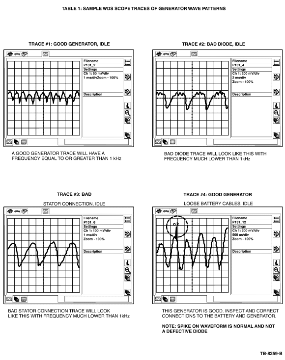 Perform a generator frequency test to diagnose cause of concern. Do not replace the generator unless a frequency test indicates a fault. This TSB provides step-by-step directions for performing a generator frequency test using the WDS oscilloscope function.