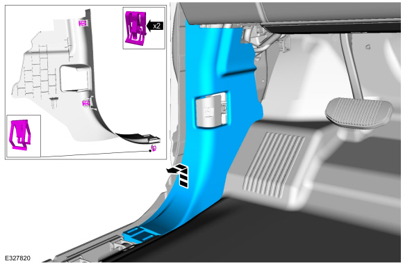 10. Release the clips and remove the left lower cowl trim panel. Refer to WSM, Section 501-12 Instrument Panel and Console, Removal and Installation, Instrument Panel. (Figure 11)