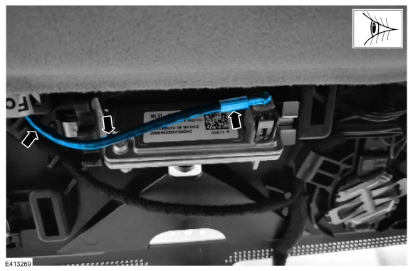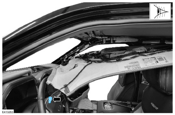 4. Replace the coaxial cable running from the IPMA camera to the A-pillar by overlaying the new coaxial cable next to the existing coaxial cable and cutting off the existing coaxial cable connectors. To do so, begin by lowering the headliner (Figure 1). Refer to Workshop Manual (WSM), Section 501-05, Interior Trim and Ornamentation, Headliner - Lowering.