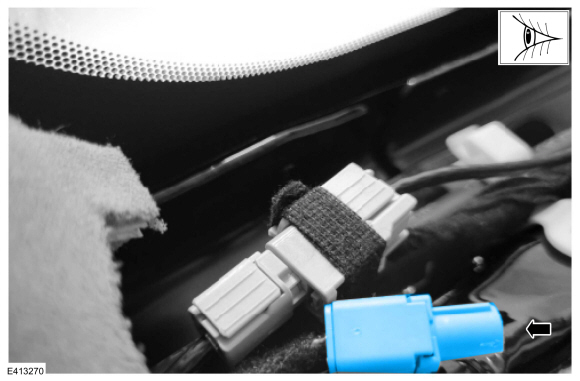 6. Reattach headliner to the roof using the headliner magnets and install a new C9128 connector to the IPMA camera and reconnect the headliner wiring harness C900 electrical connector in the A-Pillar. Refer to Figures 7-8. Cut off the existing coaxial cable connectors to make sure the original cable is not used again.